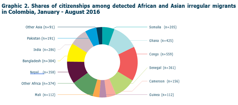 Other continental and extra-continental irregular migrants choose Colombia as a destination country (Graphic 2 below illustrates the diversity of Asian and African irregular arrivals in an eight-month period in 2016). Between 2016 and 2021, Colombia has hosted increasing numbers of displaced Venezuelans, rising to 1.74 million in 2021, representing 31 percent of all Venezuelans who fled their country. More than half of them are undocumented and join the tens of thousands of other continental migrants who continue to move into Colombia irregularly.