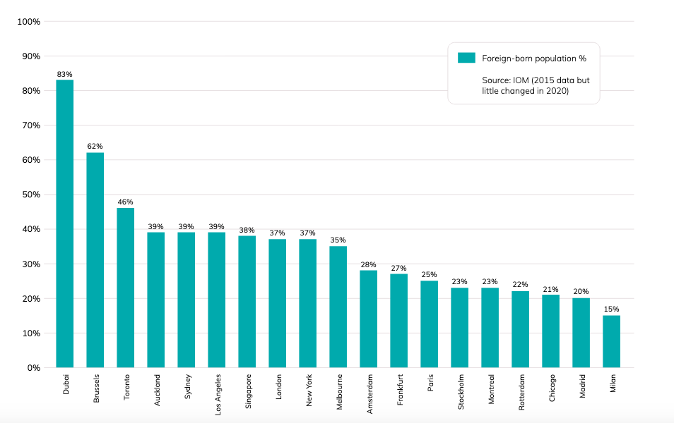 Foreign-born population in major cities as share of total city population