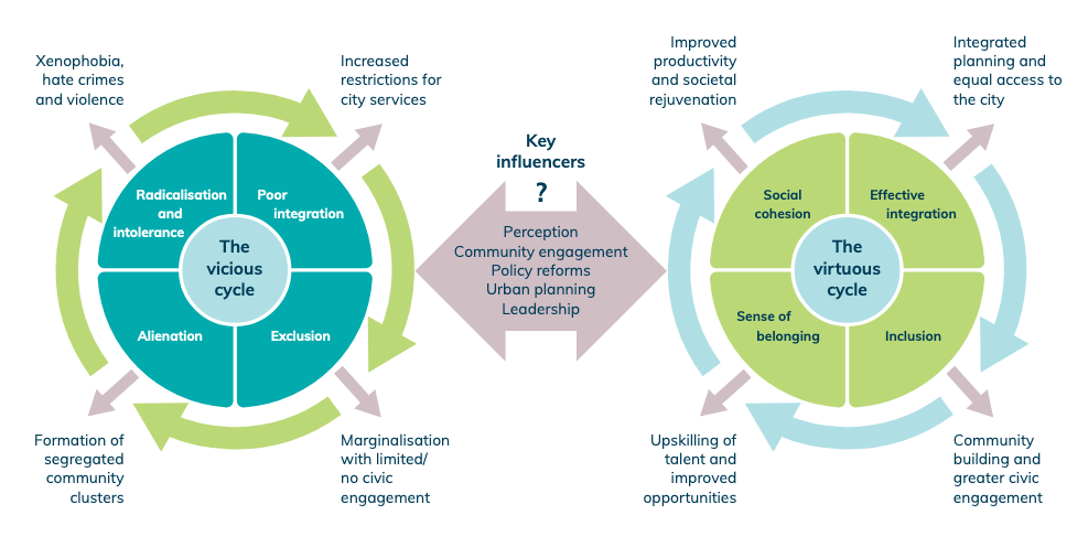 Poor integration, alienation, structural or cultural exclusion, and intolerance are typical characteristics of the vicious cycle that results in marginalisation, segmented communities and social discord and/or crime and possibly radicalisation. By contrast, cities that work with migrants and refugee groups to enhance social cohesion, inclusion, effective integration and offer newcomers a sense of belonging stand a high chance of activating a virtuous cycle that harnesses and facilitates conditions for diverse benefits to cities. “The arrival of migrants in urban settings can have a transformative effect in terms of their demographic, cultural, political and economic characteristics. The policies of municipal authorities are critical to ensuring migrants’ integration within and contribution to the overall development of localities.” While migration policy is often discussed nationally, the lived reality of settlement and integration is uniquely local and urban.