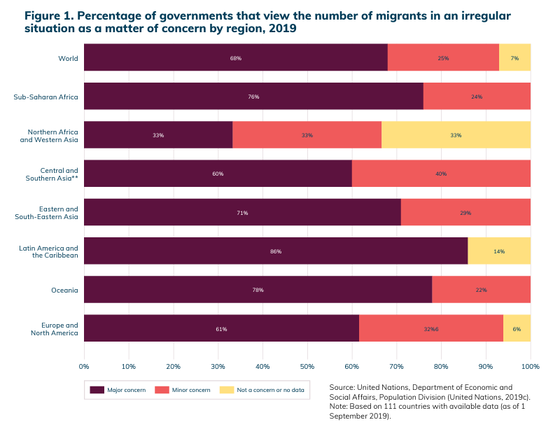 Anxiety over irregular migration is not confined to Europe and the US. In 2019, a UN survey found that in all regions of the world except Northern Africa and Western Asia most governments regarded the number of irregular migrants on their soil to be a matter of “major concern” (see Figure 1). It is hard to determine whether policy or government-level positions are reflected in public attitudes. Gallup, Ipsos, WorldValuesSurvey, and the Pew Research Centre all measure public opinion on migration issues, but their methodologies and specific survey questions vary widely, as do their conclusions, with some showing swings towards more welcoming attitudes towards migrants and others the opposite. In this author’s opinion, drawing conclusions about the hardening or softening of attitudes towards migration globally from such polls is hazardous and open to bias.