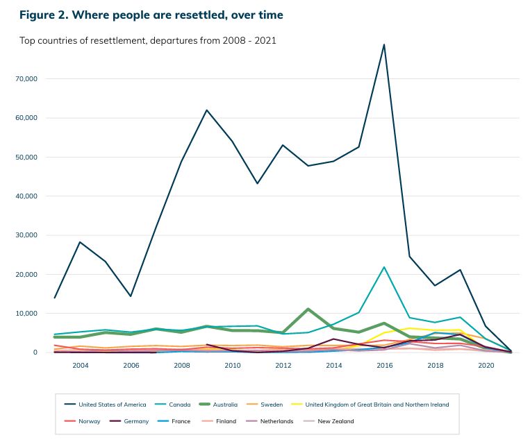 As at 28 February 2021. Only the top 11 countries of resettlement are included. Resettlement includes here only those resettled with the involve- ment of UNHCR. Source: Refugee Council of Australia 2021 (page 5)