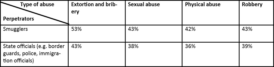The range of violations reported by migrants through 4Mi and by interviewed ‘observers’ in migrant transit locations include robbery, deception, sexual assault, physical assault, disappearances (sometimes trafficking), holding people against their will, extortion, detention and even death (normally through extreme negligence resulting in vehicle accidents and dehydration or starvation due to a lack of access to water and food, rather than deliberate murder). The alarming findings of the 4Mi data gathering over the last two years indicates that smugglers are the major perpetrators of all these violations but that collectively different state officials are also actively perpetrating violations against migrants. A selection of these findings are illustrated in the table below.