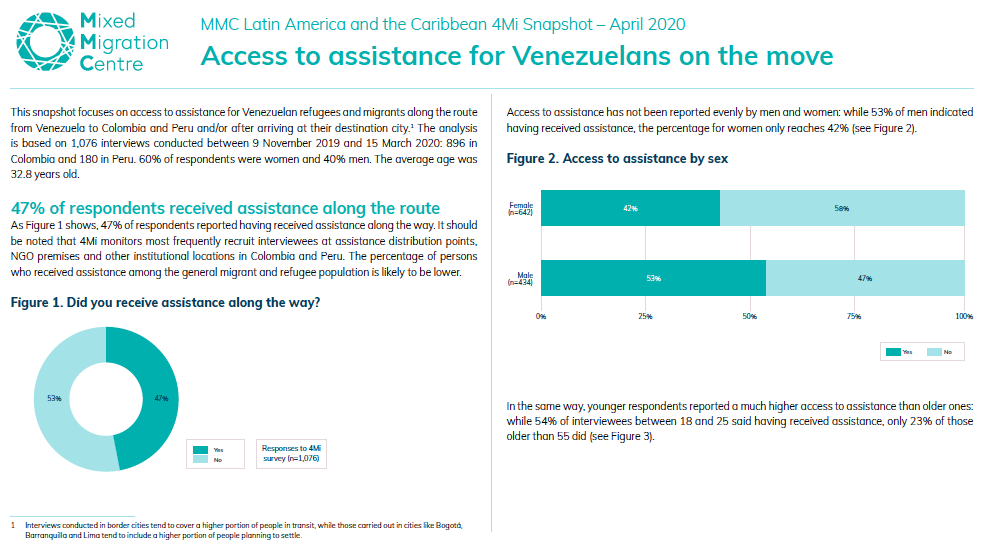 This snapshot focuses on access to assistance for Venezuelan refugees and migrants along the route from Venezuela to Colombia and Peru and/or after arriving at their destination city. The analysis is based on 1,076 interviews conducted between 9 November 2019 and 15 March 2020: 896 in Colombia and 180 in Peru.