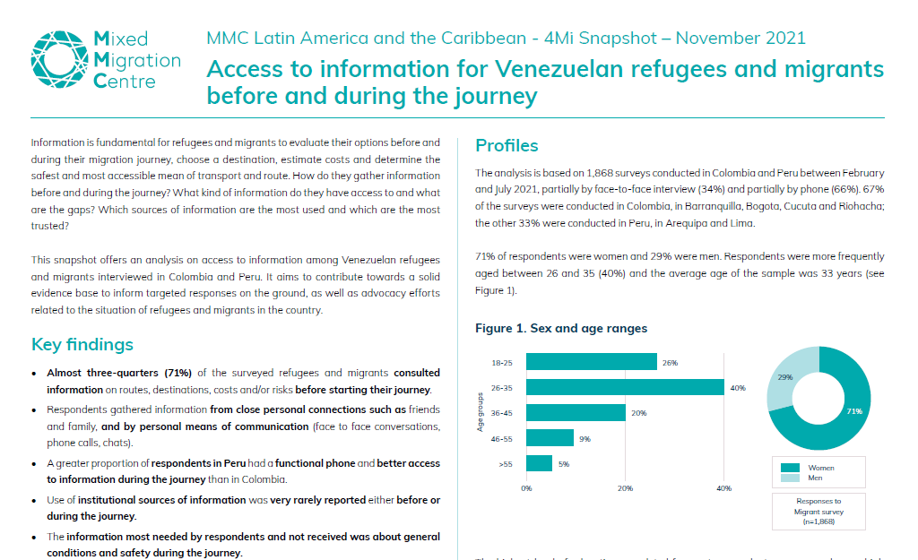 Information is fundamental for refugees and migrants to evaluate their options before and during their migration journey, choose a destination, estimate costs and determine the safest and most accessible mean of transport and route. How do they gather information before and during the journey? What kind of information do they have access to and what are the gaps? Which sources of information are the most used and which are the most trusted? The analysis is based on 1,868 surveys conducted in Colombia and Peru between February and July 2021, partially by face-to face interview and partially by phone.