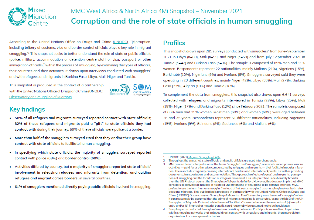 This snapshot seeks to better understand the role of state or public officials (police, military, accommodation or detention centre staff or visa, passport or other immigration officials), within the process of smuggling, by examining the types of officials, their countries and their activities. It draws upon interviews conducted with smugglers and with refugees and migrants in Burkina Faso, Libya, Mali, Niger and Tunisia.