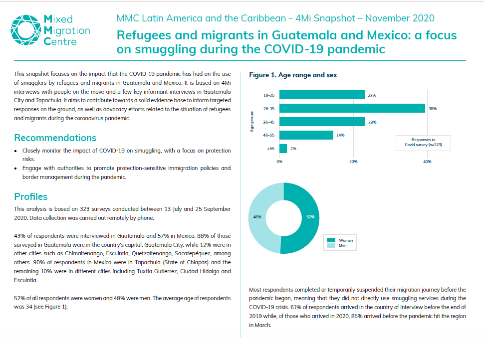 This snapshot focuses on the impact that the COVID-19 pandemic has had on the use of smugglers by refugees and migrants in Guatemala and Mexico. It is based on 4Mi interviews with people on the move and a few key informant interviews in Guatemala City and Tapachula. It aims to contribute towards a solid evidence base to inform targeted responses on the ground, as well as advocacy efforts related to the situation of refugees and migrants during the coronavirus pandemic. This analysis is based on 323 surveys conducted between 13 July and 25 September 2020. Data collection was carried out remotely by phone.