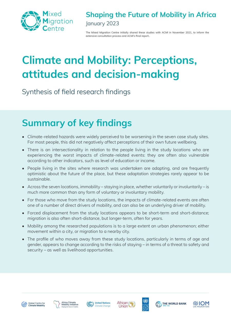 The 2020 Africa Migration Report highlighted the need for “a new paradigm on African migration” and raising awareness of the link between climate change and forced mobility. The synthesis report and the individual case studies presented here aim to contribute to these ambitions and provide knowledge to support the Africa Agenda 2063, the Sustainable Development Goals, the priorities outlined by the Secretary-General for the 2019 Climate Action Summit and the proposed activities linked to climate change and migration by the African Union as part of the three-year implementation plan of action for the Global Compact for Safe, Orderly and Regular Migration in Africa.