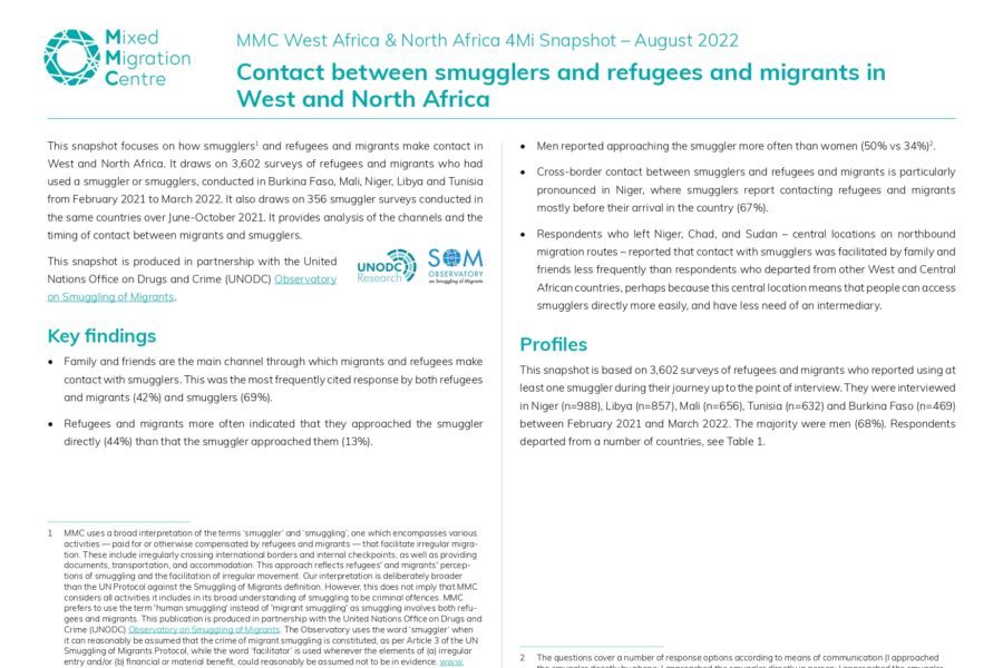 This snapshot focuses on how smugglers and refugees and migrants make contact in West and North Africa. It draws on 3,602 surveys of refugees and migrants who had used a smuggler or smugglers, conducted in Burkina Faso, Mali, Niger, Libya and Tunisia from February 2021 to March 2022. It also draws on 356 smuggler surveys conducted in the same countries over June-October 2021. It provides analysis of the channels and the timing of contact between migrants and smugglers.