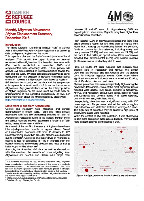 This month, the paper focuses on internal movement within Afghanistan. It is based on interviews with 354 people conducted in November 2016 and supplemented with secondary data.