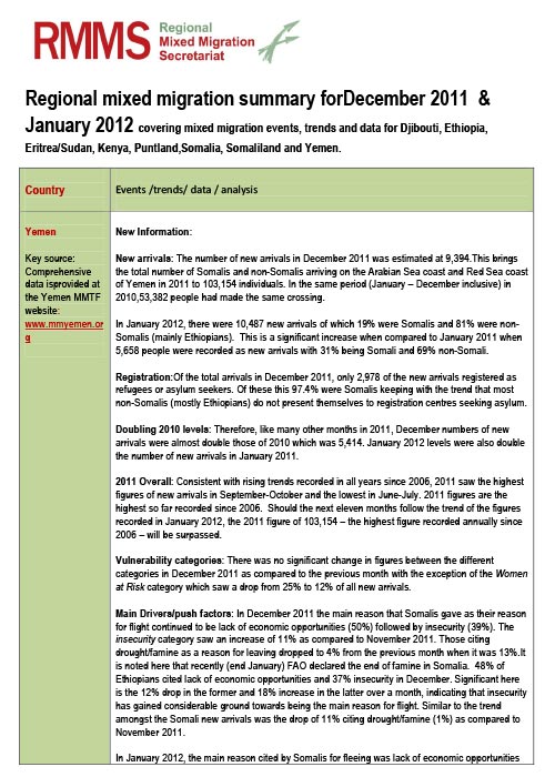 Regional mixed migration summary for December 2011 & January 2012 covering mixed migration events, trends and data for Djibouti, Ethiopia, Eritrea/Sudan, Kenya, Puntland,Somalia, Somaliland and Yemen.