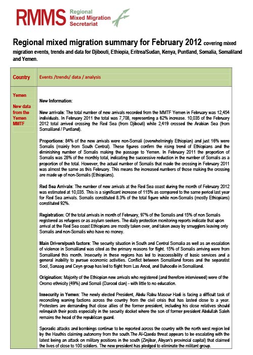 Regional mixed migration summary for February 2012 covering mixed migration events, trends and data for Djibouti, Ethiopia, Eritrea/Sudan, Kenya, Puntland, Somalia, Somaliland and Yemen.