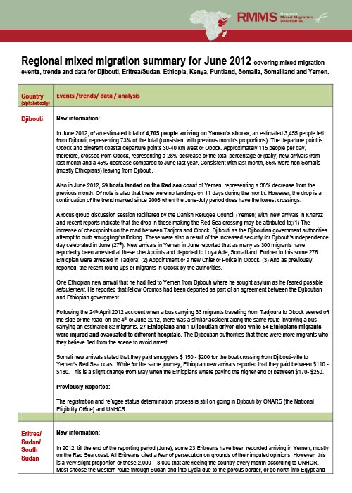 Regional mixed migration summary for June 2012 covering mixed migration events, trends and data for Djibouti, Eritrea/Sudan, Ethiopia, Kenya, Puntland, Somalia, Somaliland and Yemen.
