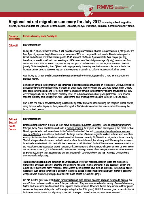 Regional mixed migration summary for July 2012 covering mixed migration events, trends and data for Djibouti, Eritrea/Sudan, Ethiopia, Kenya, Puntland, Somalia, Somaliland and Yemen.