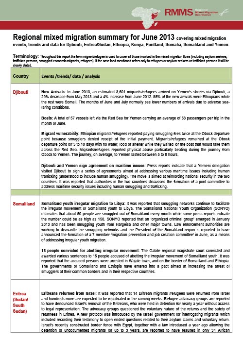Regional mixed migration summary for June 2013 covering mixed migration events, trends and data for Djibouti, Eritrea/Sudan, Ethiopia, Kenya, Puntland, Somalia, Somaliland and Yemen.