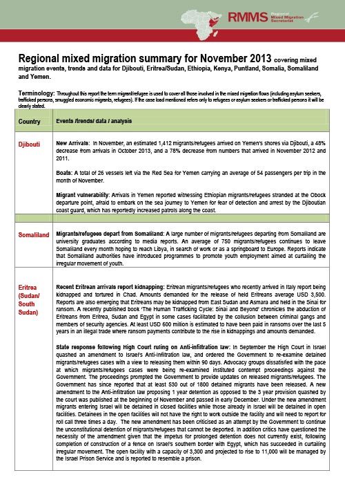 Regional mixed migration summary for November 2013 covering mixed migration events, trends and data for Djibouti, Eritrea/Sudan, Ethiopia, Kenya, Puntland, Somalia, Somaliland and Yemen.