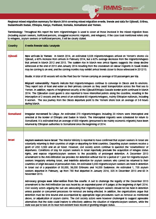 Regional mixed migration summary for March 2014 covering mixed migration events, trends and data for Djibouti, Eritrea, Sudan/South Sudan, Ethiopia, Kenya, Puntland, Somalia, Somaliland and Yemen.