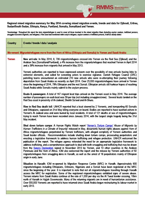 Regional mixed migration summary for May 2014 covering mixed migration events, trends and data for Djibouti, Eritrea, Sudan/South Sudan, Ethiopia, Kenya, Puntland, Somalia, Somaliland and Yemen.
