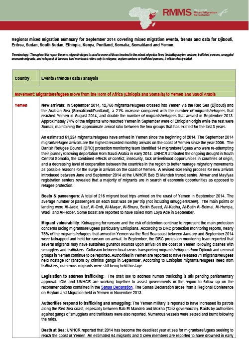 Regional mixed migration summary for September 2014 covering mixed migration events, trends and data for Djibouti, Eritrea, Sudan, South Sudan, Ethiopia, Kenya, Puntland, Somalia, Somaliland and Yemen.