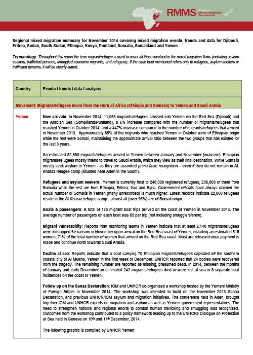 Regional mixed migration summary for November 2014 covering mixed migration events, trends and data for Djibouti, Eritrea, Sudan, South Sudan, Ethiopia, Kenya, Puntland, Somalia, Somaliland and Yemen.