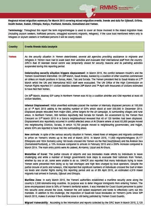 Regional mixed migration summary for March 2015 covering mixed migration events, trends and data for Djibouti, Eritrea, South Sudan, Sudan, Ethiopia, Kenya, Puntland, Somalia, Somaliland and Yemen.