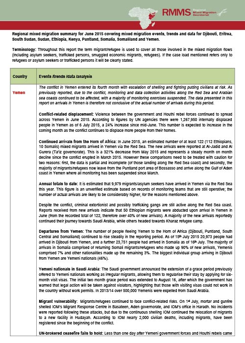 Regional mixed migration summary for June 2015 covering mixed migration events, trends and data for Djibouti, Eritrea, South Sudan, Sudan, Ethiopia, Kenya, Puntland, Somalia, Somaliland and Yemen.