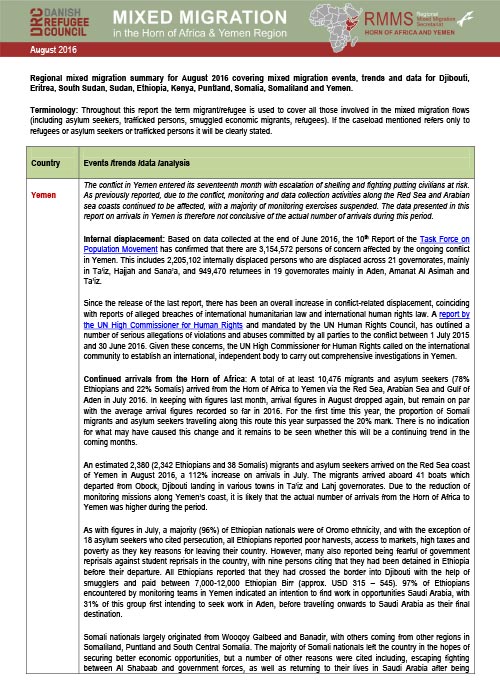 Regional mixed migration summary for August 2016 covering mixed migration events, trends and data for Djibouti, Eritrea, South Sudan, Sudan, Ethiopia, Kenya, Puntland, Somalia, Somaliland and Yemen.