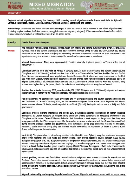 The conflict in Yemen entered its twenty-second month with shelling and fighting putting civilians at risk. As previously reported, due to the conflict, monitoring and data collection activities along the Red Sea and Arabian sea coasts continued to be affected, with a majority of monitoring exercises suspended. Therefore the data presented in this report concerning new arrivals in Yemen cannot be considered comprehensive or conclusive.