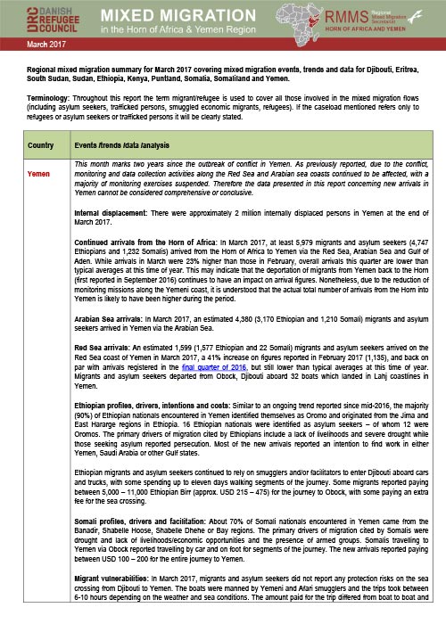 This month marks two years since the outbreak of conflict in Yemen. As previously reported, due to the conflict, monitoring and data collection activities along the Red Sea and Arabian sea coasts continued to be affected, with a majority of monitoring exercises suspended. Therefore the data presented in this report concerning new arrivals in Yemen cannot be considered comprehensive or conclusive.