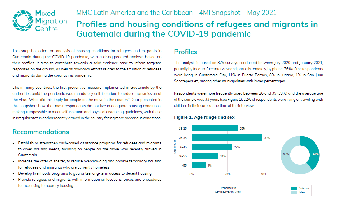 This snapshot offers an analysis of housing conditions for refugees and migrants in Guatemala during the COVID-19 pandemic, with a disaggregated analysis based on their profiles. It aims to contribute towards a solid evidence base to inform targeted responses on the ground, as well as advocacy efforts related to the situation of refugees and migrants during the coronavirus pandemic. The analysis is based on 375 surveys conducted between July 2020 and January 2021, partially by face-to-face interview and partially remotely, by phone.
