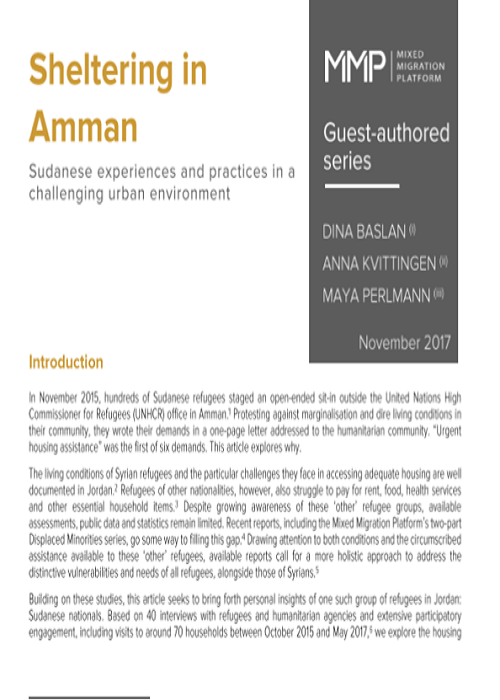 Building on previous studies, this article seeks to bring forth personal insights of Sudanese refugees in Jordan. Based on 40 interviews with refugees and humanitarian agencies and extensive participatory engagement, including visits to around 70 households between October 2015 and May 2017, this article explores the housing conditions and sheltering practices among Sudanese refugees in Amman.