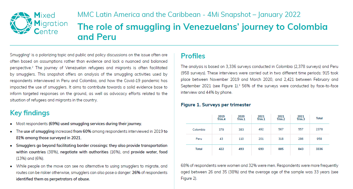 Smuggling is a polarizing topic and public and policy discussions on the issue often are often based on assumptions rather than evidence and lack a nuanced and balanced perspective. The journey of Venezuelan refugees and migrants is often facilitated by smugglers. This snapshot offers an analysis of the smuggling activities used by respondents interviewed in Peru and Colombia, and how the Covid-19 pandemic has impacted the use of smugglers. It aims to contribute towards a solid evidence base to inform targeted responses on the ground, as well as advocacy efforts related to the situation of refugees and migrants in the country. The analysis is based on 3,336 surveys conducted in Colombia and Peru.